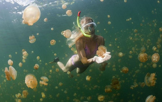 在这里,游客不必像在别处大海中看到水母时要转身逃跑,以免被蜇伤,反而可以抱着它们照相、嬉戏。