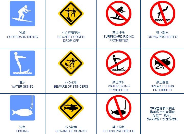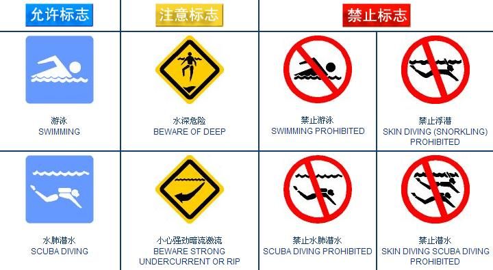 去一个地方潜水或游泳,一定要看看当地的水域安全标志,看看是否可以进行潜水、游泳,以免发生危险。