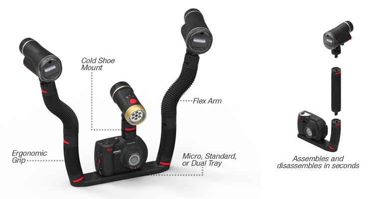 SeaLife创造的Flex-Connect是为复杂的和不稳定的摄像机底座、灯光和其它配件一个简单的解决方案。Flex-Connect 的使用者只要花不到5分钟的时间就可以组装好自己的摄像机和照明灯等配件Flex-Connect系统不但各个组件牢固安全,人体工程学设计和绝佳的视觉效果绝对是个给产品加分的亮点。